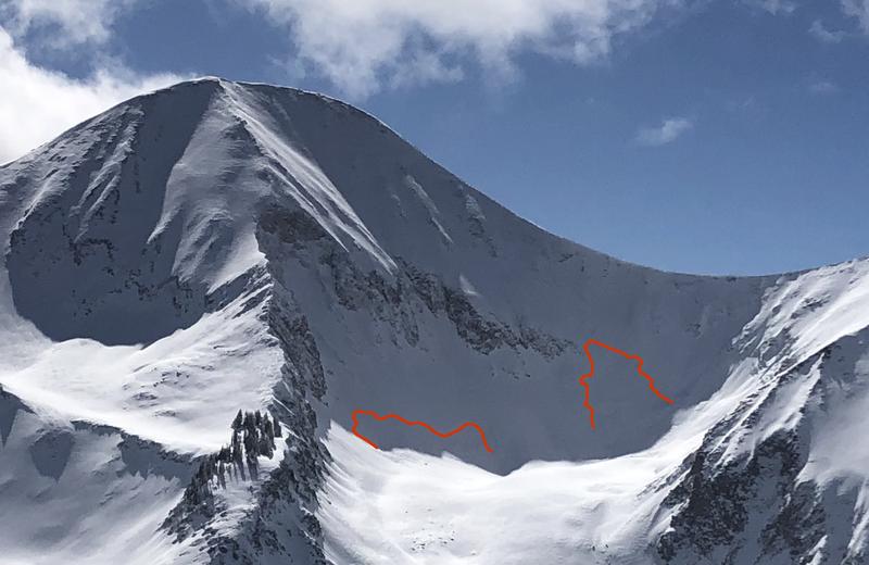 In our travels on Sunday, we observed these two natural avalanches from a distance beneath the N Face of Mount Tukuhnikivatz in Red Snow Cirque. Somewhat "pockety" in nature, they nevertheless had crowns up to 4' deep and could have easily buried or killed someone. Human-triggered avalanches such as this remain likely.