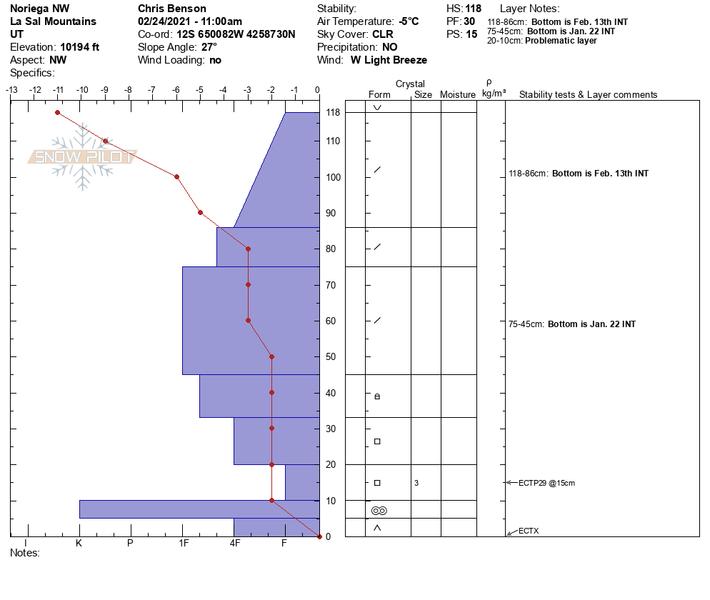 Warm temperatures and time have helped consolidate the snowpack, but weak layers are still present, especially in shady areas at higher elevations. The snow we received last week has settled into a 1-3' slab that may disguise signs of the buried weak layers underneath. Yesterday, I found supportive snow and experienced localized whumpfing on a ridgeline where the snowpack was thinner and weaker. On a NW aspect near treeline, I observed poor snowpack structure and a stubborn slab. On a north aspect above treeline, the snowpack is deeper and contains stiff, wind-drifted snow that rests on weak layers. While I didn't get any results with two Extended Column Tests (ECTX x2), in areas where this slab is thinner, you can still trigger deep and dangerous avalanches. On sunny aspects, several inches of moist snow were present and may now be supportive crusts after several warm days.