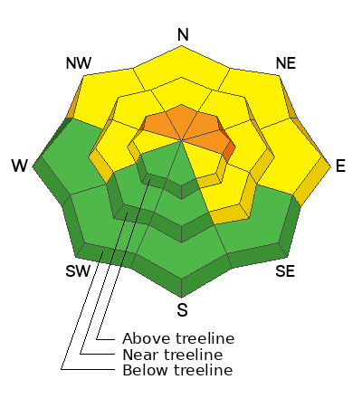 Most other terrain on the N side of the compass has MODERATE danger including slopes facing W and SE near and above treeline. Avalanches failing on a persistent weak layer are possible in these areas. Likely trigger points are thinner snowpack areas along slope margins, shallow convexities , and areas of steep, rocky, radical terrain.
