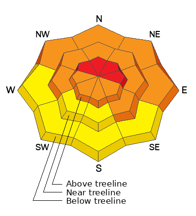 The danger is CONSIDERABLE on slopes facing W-N-NE-SE near treeline, and on slopes facing NW-NE-E below, where human triggered avalanches failing on a persistent weak layer are likely.