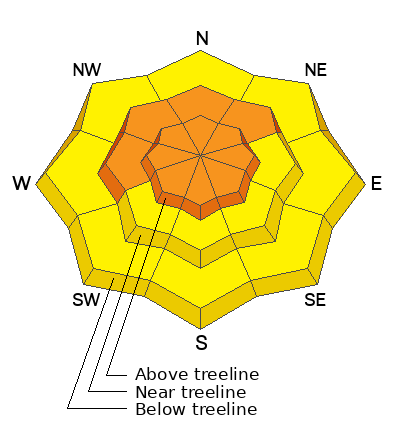 Recent snow accompanied by strong easterly winds have created a CONSIDERABLE avalanche danger on all aspects above treeline, and on steep slopes facing W-NW-N-NE near treeline. Human triggered avalanches involving both slabs of new and wind drifted snow are likely in these areas. As new snow accumulates today, the danger could be become more widespread and drop down in elevation. Be alert to changing conditions.