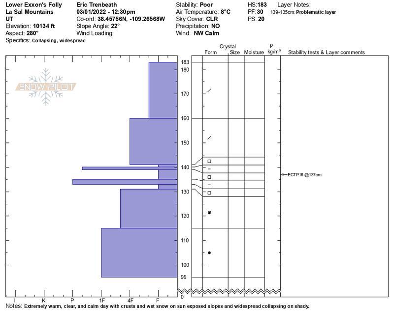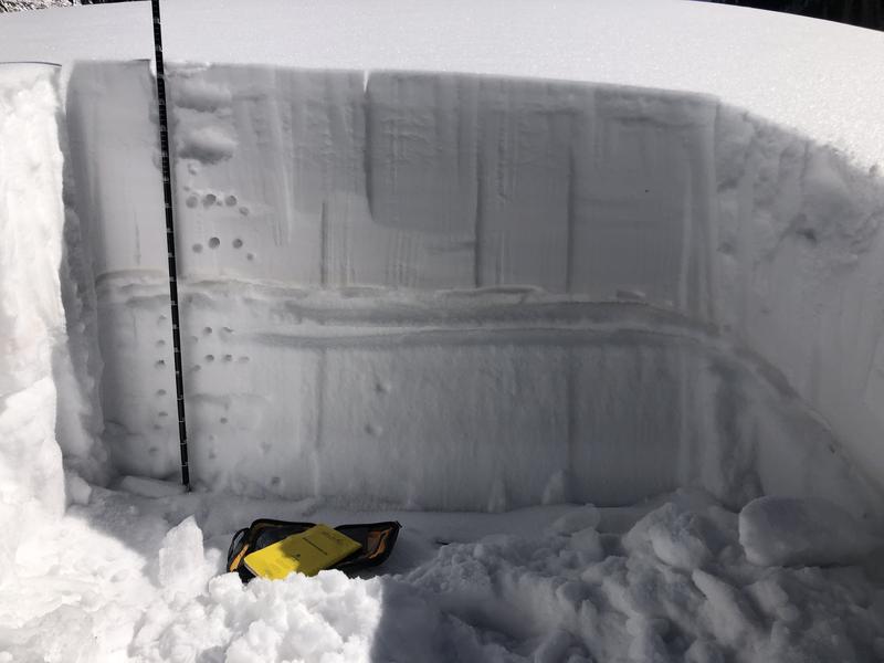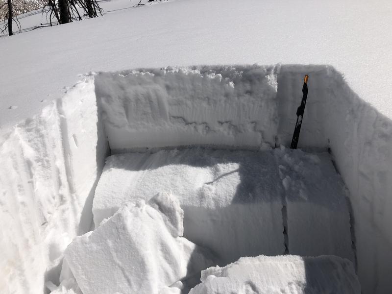 The warm sunny weather continues, and the snowpack remains dangerous. There is a slab present on a widespread weak layer of facets, and observers continue to experience frequent collapsing. The avalanche danger remains CONSIDERABLE and human triggered avalanches are likely on slopes facing W-N-SE where this weak layer exists.