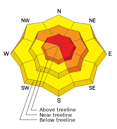 HIGH avalanche danger exists on leeward slopes above treeline. Natural and human triggered avalanches up to three feet deep are VERY LIKELY on wind loaded slopes above treeline. Backcountry travelers will also encounter unstable slabs of wind drifted snow near treeline, where the danger is CONSIDERABLE. Out of the wind zone, you'll find a MODERATE avalanche danger where both dry loose and soft slab avalanches involving the new snow are POSSIBLE.
