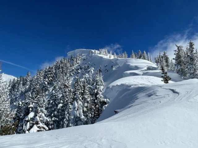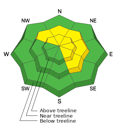 The avalanche danger is MODERATE. Human triggered avalanches are POSSIBLE in areas of wind drifted snow that exist near and above treeline on slopes that face NW-N-NE-E-SE. The greatest danger is predominantly found above treeline where drifts can be found up to 2 feet deep.