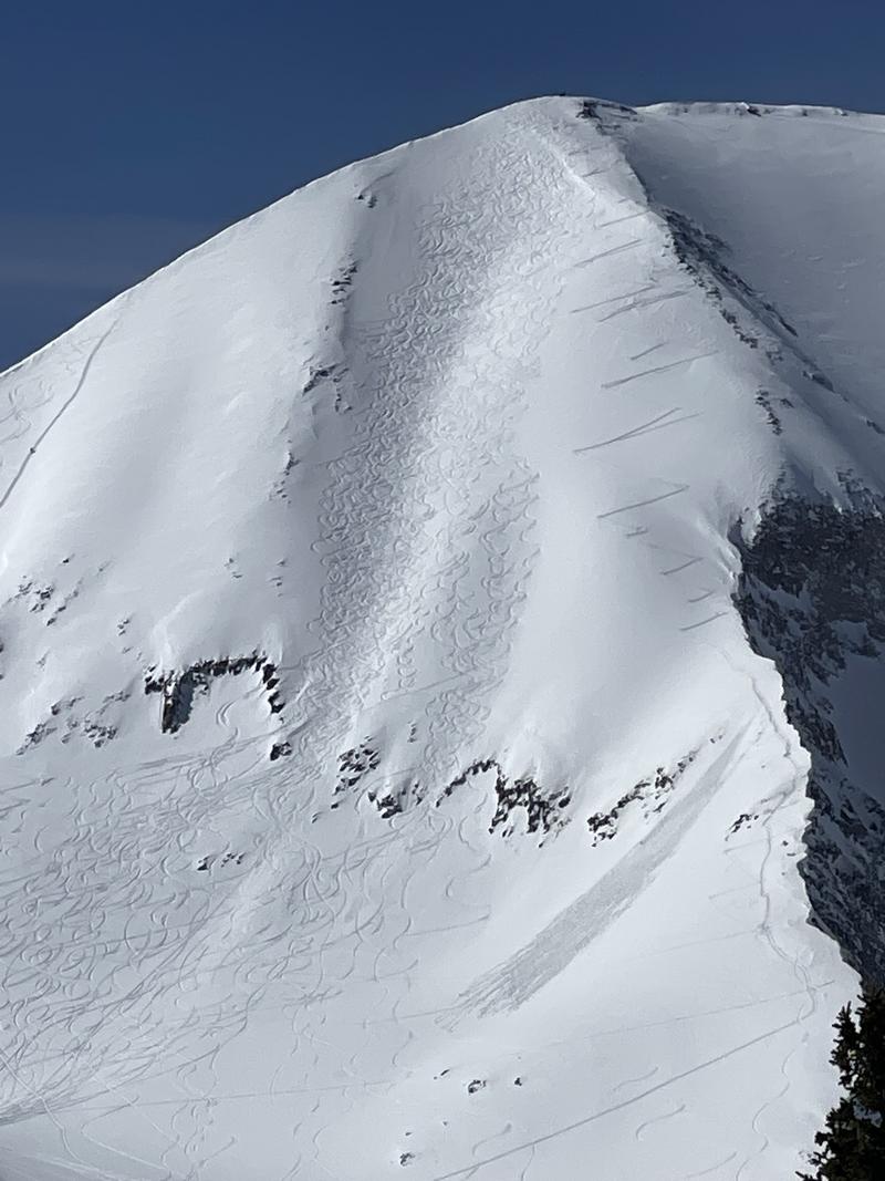 Cornices are massive and with such warm temperatures, natural cornice fall is a real possibility. Give cornices, and slopes below, a wide berth.