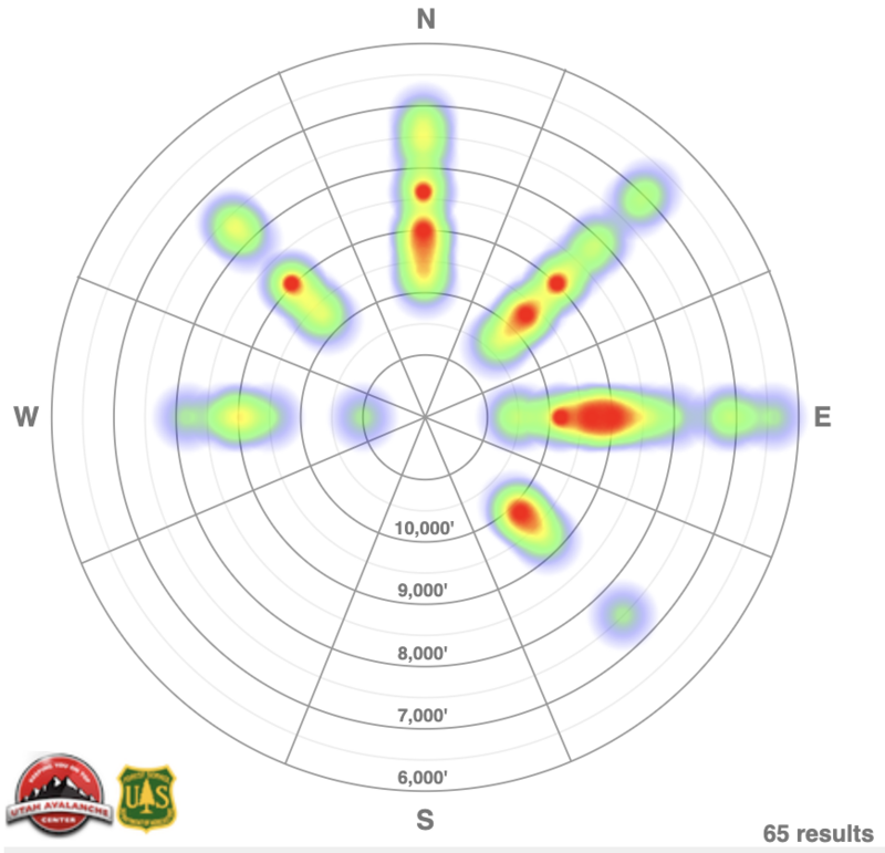 Our avalanche heat map for the Ogden, Salt Lake and Provo mountains - which shows avalanche activity by aspect and elevation - over the past week is below. Notice the widespread activity on most aspects and all elevations.