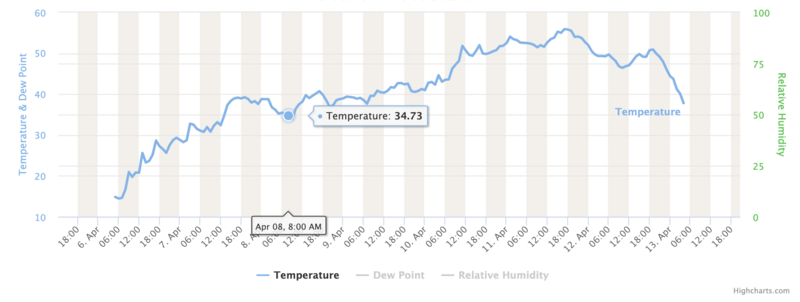And we're desperate for it (even though the cold front will offer only an inch or two of snow), as overnight temps are again in the upper 30s to low 40s. Many areas haven't seen a decent refreeze since last weekend (see Wildcat@7700' graph below)