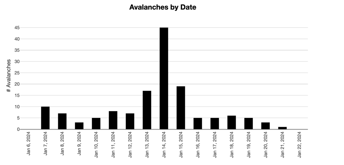 Your main concern is triggering a large and unsurvivable hard slab avalanche that fails on weak faceted snow 2-5'+ deep. This weak faceted snow is a persistent weak layer that formed during our extended dry spell in December and was subsequently buried on January 4th. The initial indicator avalanche of this newly buried PWL was just two days later on the 6th in Main Porter Fork of MCC with an upward trend of avalanche activity with additional storms the following week. The world fell apart with an Extreme danger on Sunday Jan 14th with widespread avalanches on many aspects and elevations. Over time, this unstable combination has become more stubborn and yet they are no less deadly. See all regions avalanche frequency chart below.