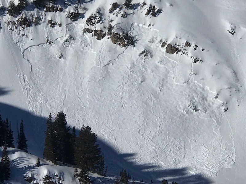 The most recent avalanches to occur in the old snow happened Tuesday. On the south face of Gobblers Knob, Trent and I saw a natural soft slab avalanche on a steep face at 9800' below rocks that occurred sometime between 1 pm - 1:30 pm. The crown looked to be 12-18” deep which leads us to believe it occurred on the persistent weak layer of facets adjacent to the melt-freeze crust. This avalanche was about 150' wide and ran about 250'. See full observation HERE.