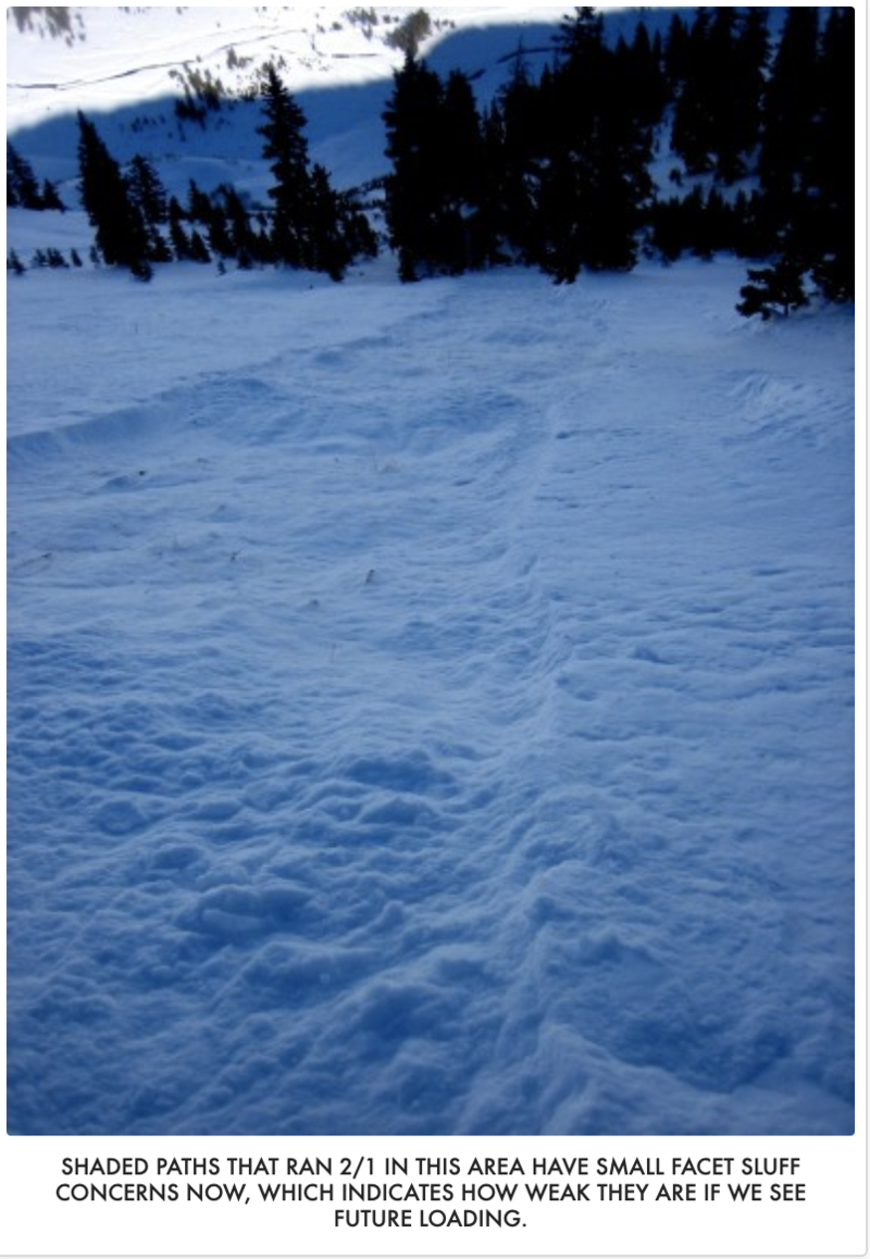 3 - Dry Sluffs: The surface snow is becoming so weak and cohesionless that skiers and riders may start to trigger "facet sluffs" in the coming days in steep northerly terrain. (example from Crested Butte Avalanche Center forecaster Zach Guy from a couple years ago)