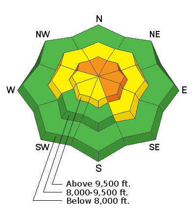 Our mountains are plagued with weak faceted snow, and if you look just to the left, you will see our locator rose. Everywhere on that rose that is shaded blue is where this avalanche problem exists. We have a weak layer, and on the 13th of December, we started building our slab when new snow fell on top of this fragile faceted snow.