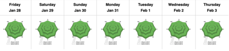 Skies are clear. Temperatures, mercifully, are on the plus side of zero with most stations at or near 24 hour "highs" of 5-10°F! North to northwest winds are light except along the highest elevations where they've been gusting into the 30s and 40s for a couple hours. We got traced again yesterday (Bill Brandt photo). For today, we'll have sunny skies, light northwest winds and temperatures warming into the 20s.