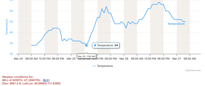 See a screen capture of the Mill D North weather station (~9000' elevation) in Big Cottonwood Canyon. The last 'decent' refreeze was two mornings ago. For some areas outside of the Cottonwoods, it's been even longer.