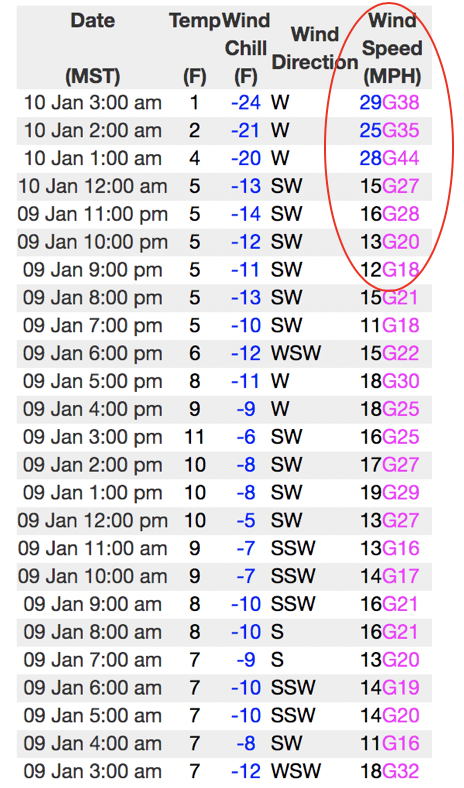Above, 24 hour data from Windy Peak (10,662') where you can clearly see yesterday's virtually non existent winds ramping to this mornings more robust winds.
