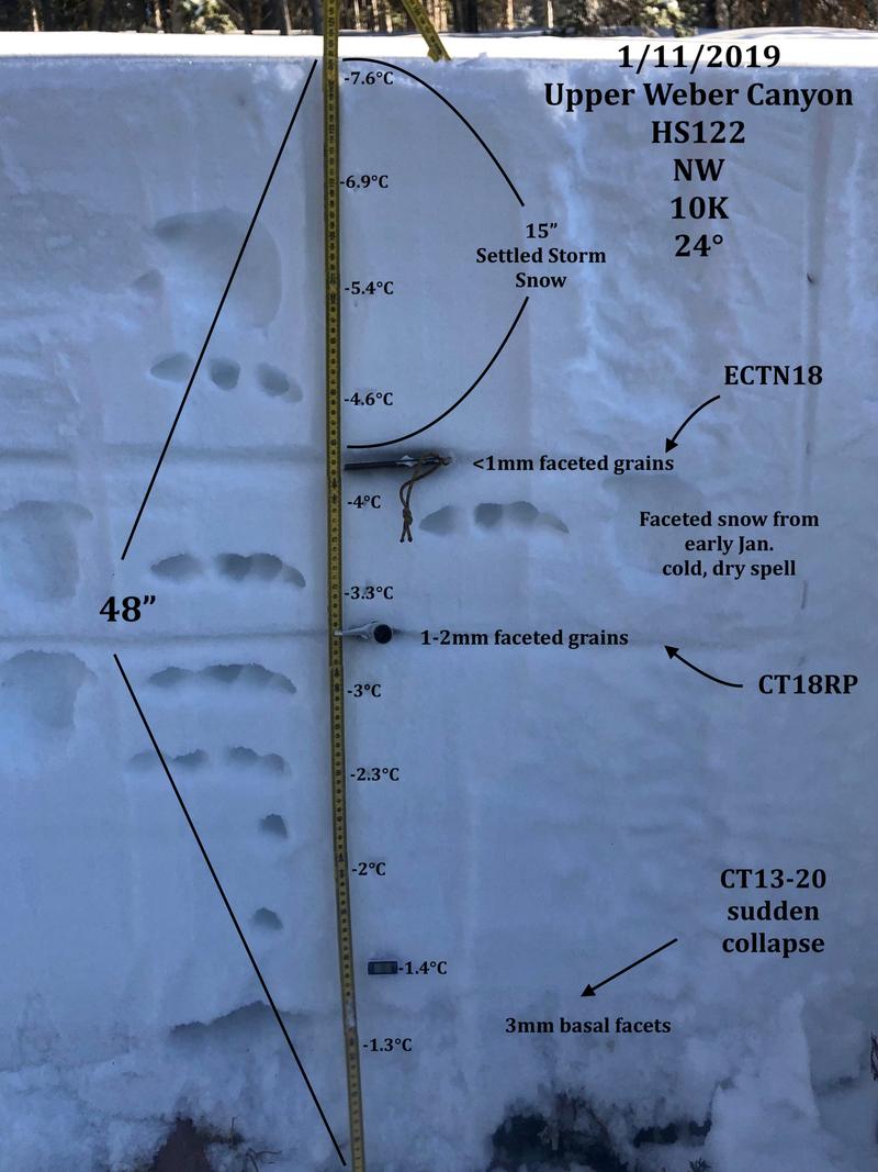 A beautifully detailed pit submitted by JG who was in Weber Canyon yesterday, reveals some bad juju near our faceted layers of snow. More on his travels here.