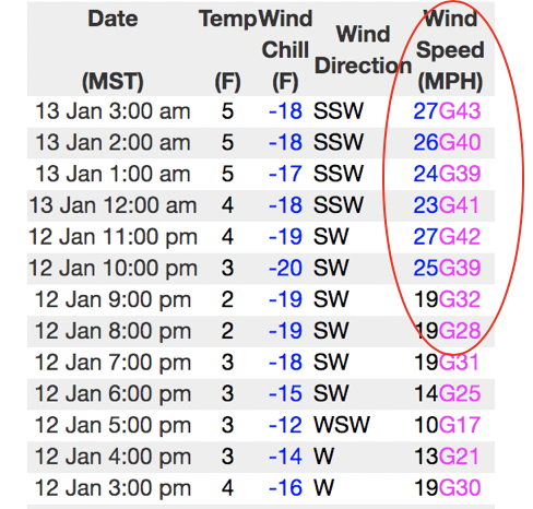 Above is a 12 hour data set from Lofty Lake Peak (11,186') showing the bump in overnight winds.