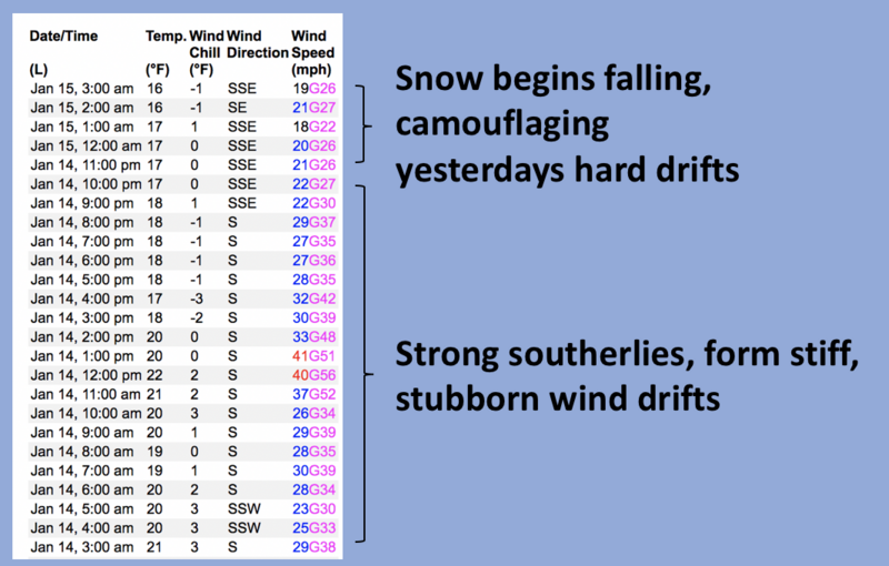 Yesterday's stubborn wind drifts are camouflaged under a few inches of fresh snow, making them hard to detect. Found mostly on the leeward side of upper elevation ridges, I wouldn't be too surprised to find a fresh drift cross-loaded around terrain features like chutes and gullies and they may react to our additional weight. This is an easy avalanche problem to avoid... lose the wind and you lose the problem.