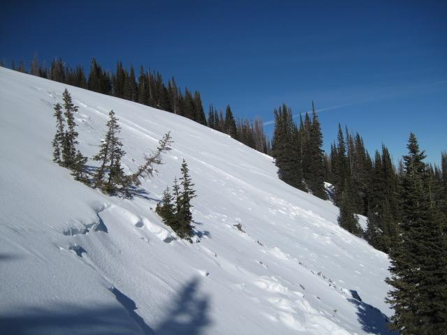 Overall snow depths are 2-3 feet with many slopes above treeline affected by recent winds. More sheltered slopes have recrystallized powder on the surface and a soft crust on southerly facing slopes. Ted Scroggin put it best saying "The coverage out in Mill Creek is ok, but there are many logs and stumps to watch out for. It is white, but white and lumpy." The photo below from Ted shows snow coverage in that area.