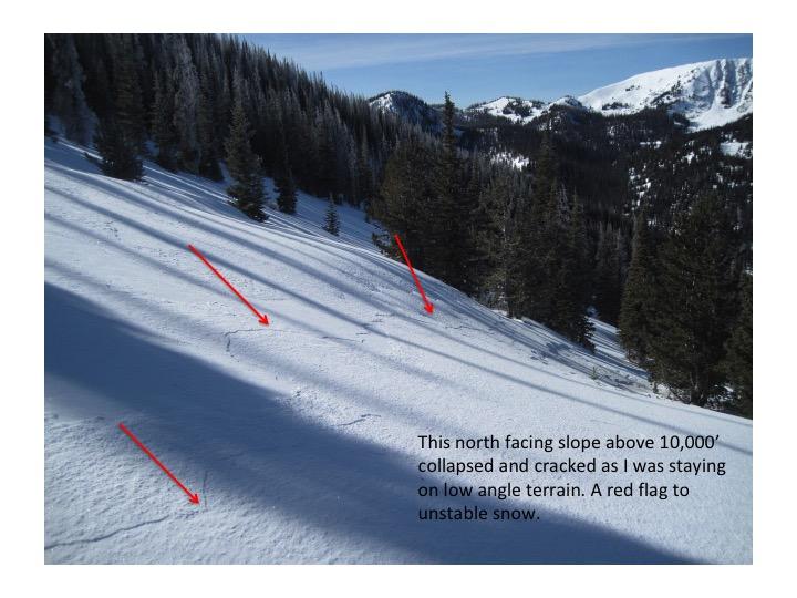 Ted says.... "It felt like the theme of the day was cracking and collapsing of the weak snow pack and some of the collapses were quite attention getting. I was not anticipating too many red flags today, but the Gold Hill zone felt fairly unstable and a little on the "spooky" moderate side of the danger scale." Some sage advice from a super knowledgeable avy, savvy pro who knows the Uinta's better than all of us.... combined!
