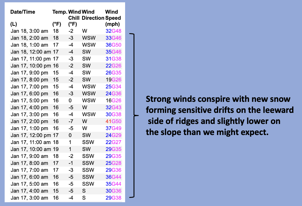 Mark had some great insight and thoughts from his field day yesterday... "Storms since Jan 5 have come with a lot of wind including last weekend. Winds had reached well into normally sheltered areas. I was surprised to see large drifts on normally sheltered terrain." Perhaps older drifts are harder to trigger, but once initiated they'll be packing a punch.