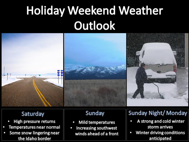 Clouds increase throughout the day and a few snow showers slide the region. West and northwest winds increase and blow into the 40's along the high ridges. Temperatures climb into the 30's with overnight lows dipping into the 20's. Increasing clouds, winds, and temperatures are on tap for Sunday. Another winter storm impacts the area early Monday into Tuesday bringing significant snow accumulations and windy conditions.