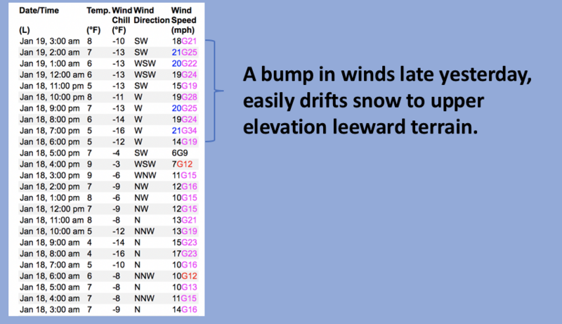Nowcast- Skies cleared overnight and temperatures crashed into the single digits, with some low laying terrain cratering into negative territory. Southwest winds blow in the mid 20's adding a bite to the air near the high peaks. Yesterday's east and northeast winds damaged our alpine terrain, but sheltered slopes harbor excellent riding conditions.