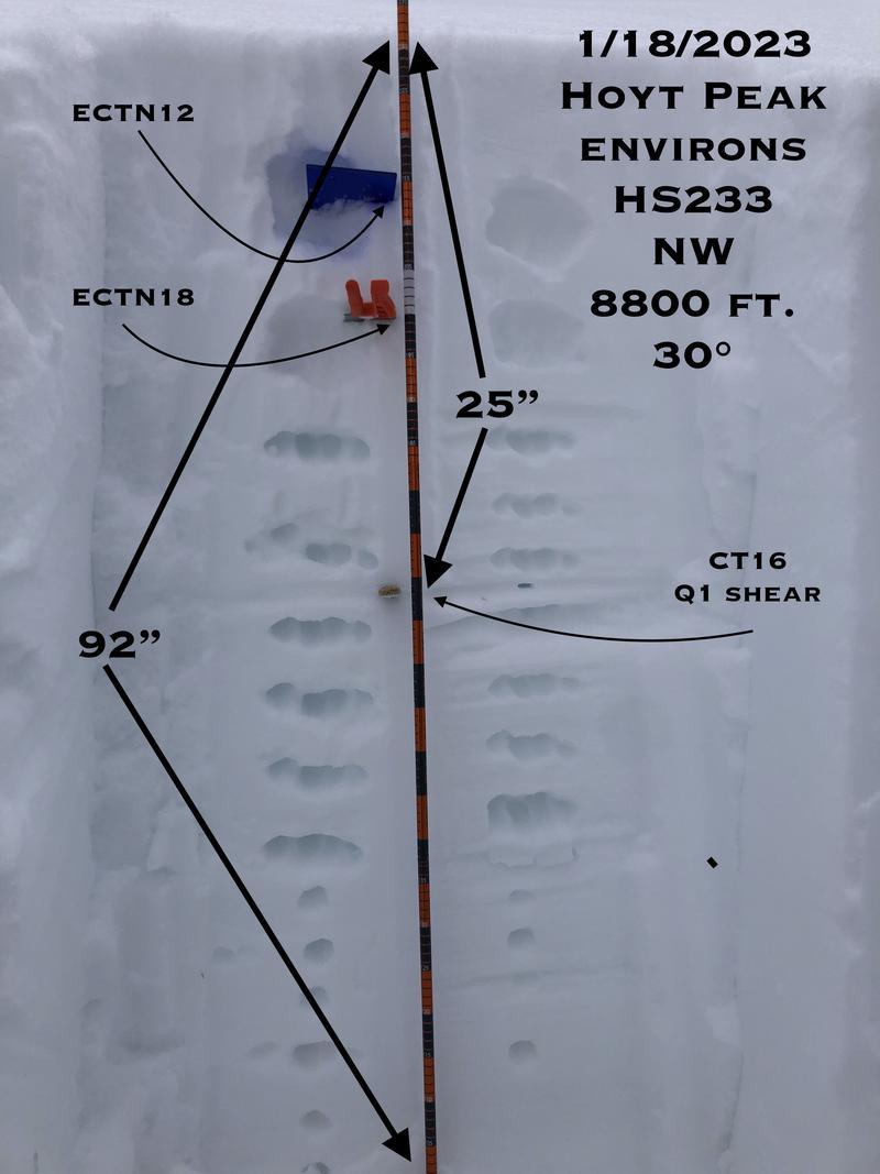 JG's beautiful pit profile from the Hoyt environs illustrates a deep snowpack, happy in its own skin. JG knows how the Uinta snowpack works and his PWL mindset has shifted... "With 7 to 8 feet of snow on the ground we weren't very concerned about the deeply buried PWL created during the November dry spell so we directed our attention to the upper 63cms (25"storm snow) since that is where we were finding instabilities in Column Tests."