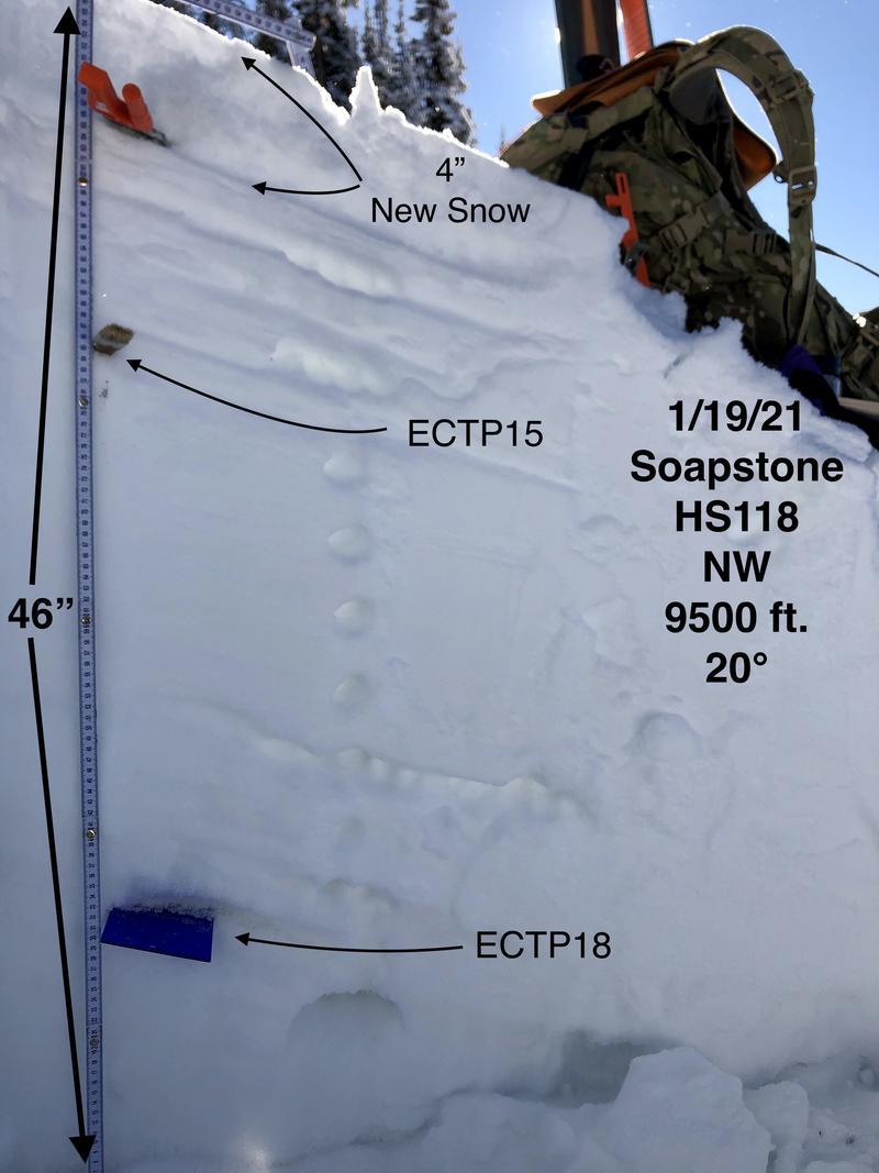 JG's beautiful pit profile clearly illustrates where the avalanche dragon resides in our current snowpack setup. The structure remains suspect and recent snowpit tests suggest you could still trigger a slide that breaks 2' deep, failing on weak, sugary, mid-pack facets. (ECTP 18 reflects these results)