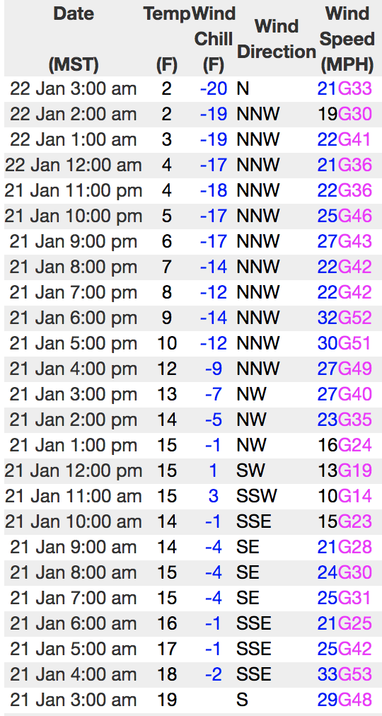 Above is hourly data from Trial Lake (9,945') and Windy Peak (10,662'). To view more regional weather stations click here.