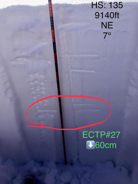 Weston D was in Smith-Morehouse yesterday and his pit profile indicates the pack is gaining strength... good news. Yet his stability tests suggest our midpack facets still remain reactive to stability tests... bad news.