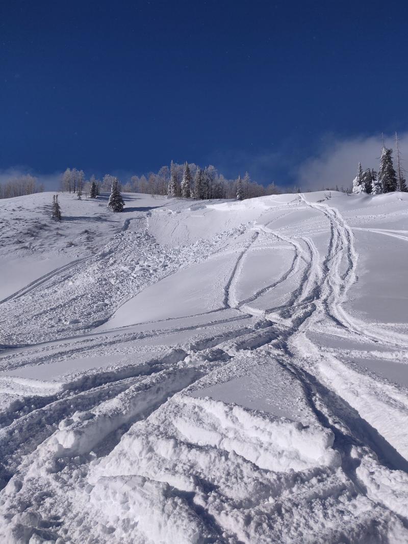 Winds have been busy at work and there's no shortage of snow to blow around and form fresh, stiff drifts along the leeward side of upper elevation ridges and around chutes and gullies. Don't get fooled into thinking today's fresh drifts are the only avalanche dragon you're dealing with. Underneath the new drifts are old, connected drifts, that once triggered, will break deeper and wider than you might expect. Today you'll want to utilize all the awareness tools in your quiver. Look for obvious clues to unstable snow like shooting cracks out in front of our skis, board, or sled. Also remember to avoid any fat, rounded piece of snow especially if it sounds hollow like a drum. And finally the hugest clue... recent avalanches on the same kind of terrain you want to ride on.