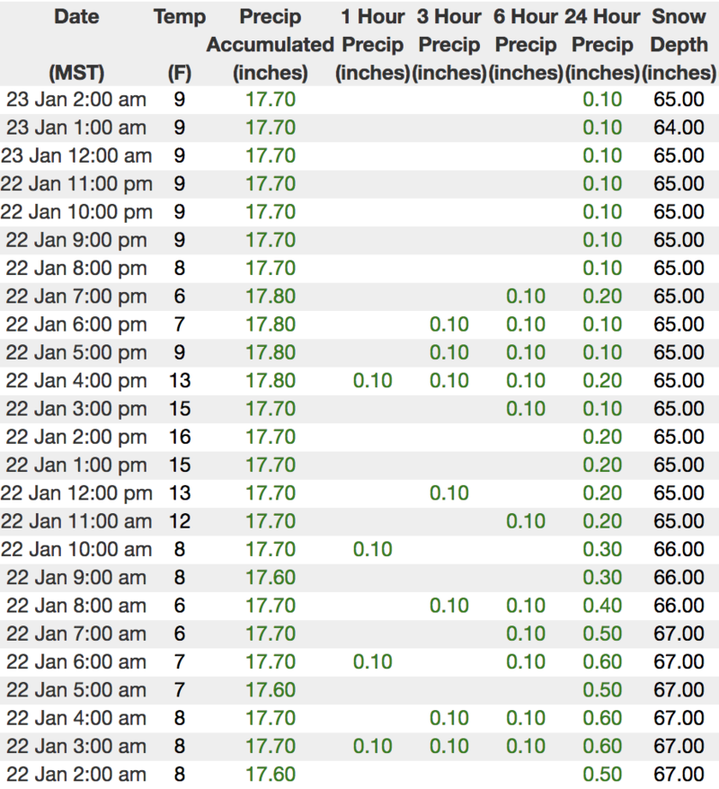 Above is hourly data from Trial Lake (9,945') and Windy Peak (10,662'). To view more regional weather stations click here.