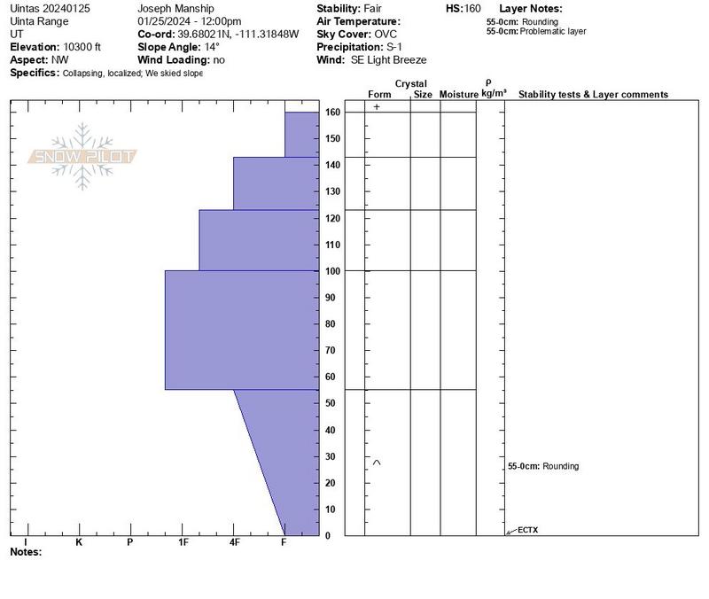 Snwo-pros Joey Manship and Wes Shirey stomped around the Mirror Lake corridor and report a little encouraging news... "The 1F slab in gaining even more strength in this area. 1F is almost leaning towards pencil hardness and over 40cm thick. The PWL has gained some strength and is not reacting in pit tests but it is still dry loose 3-4 mm facets and over 50 cm thick. I believe its starting to round but has a long way to go for any significant healing."
