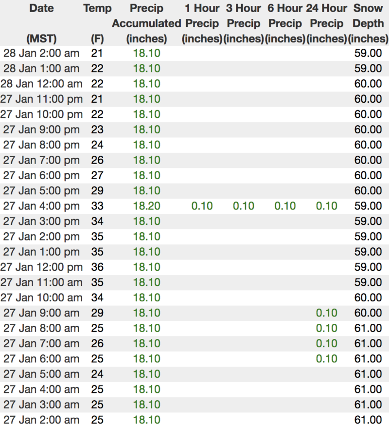 Above is hourly data from Trial Lake (9,945') and Windy Peak (10,662'). To view more regional weather stations click here.