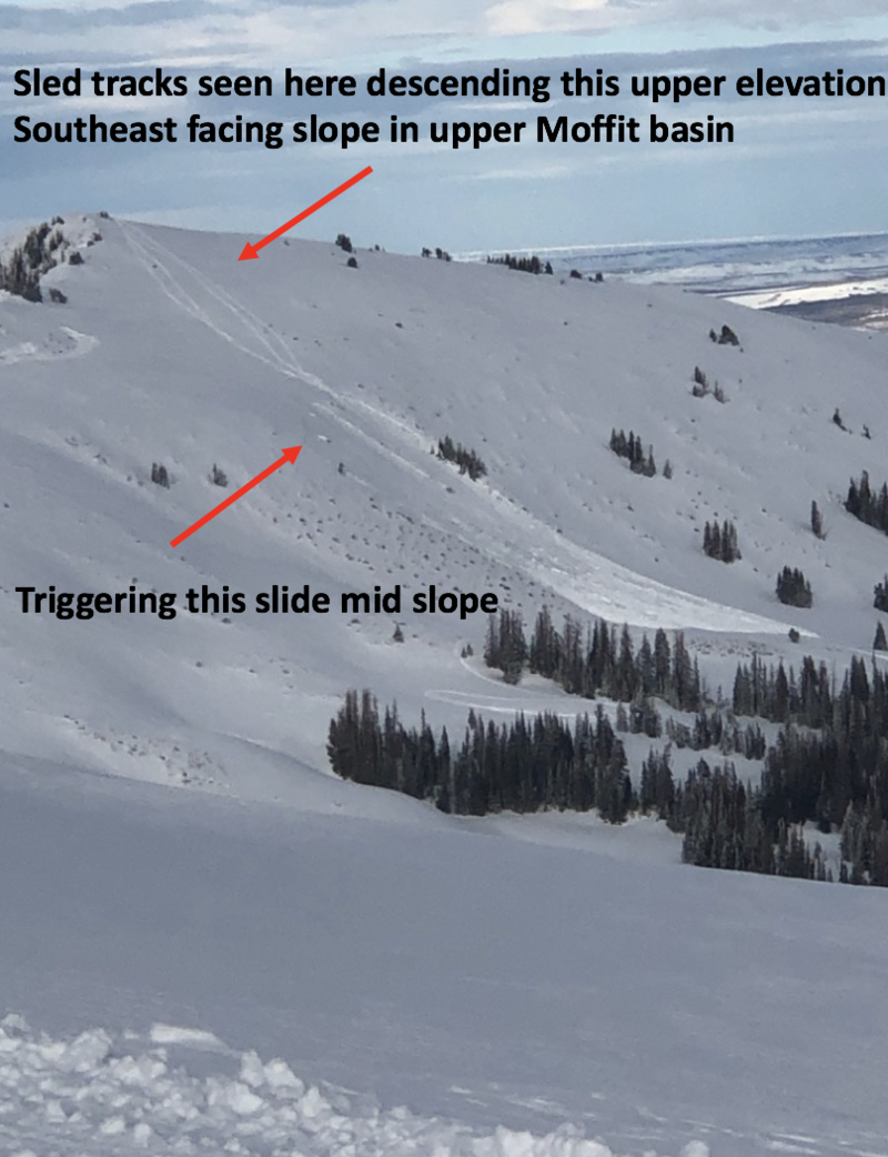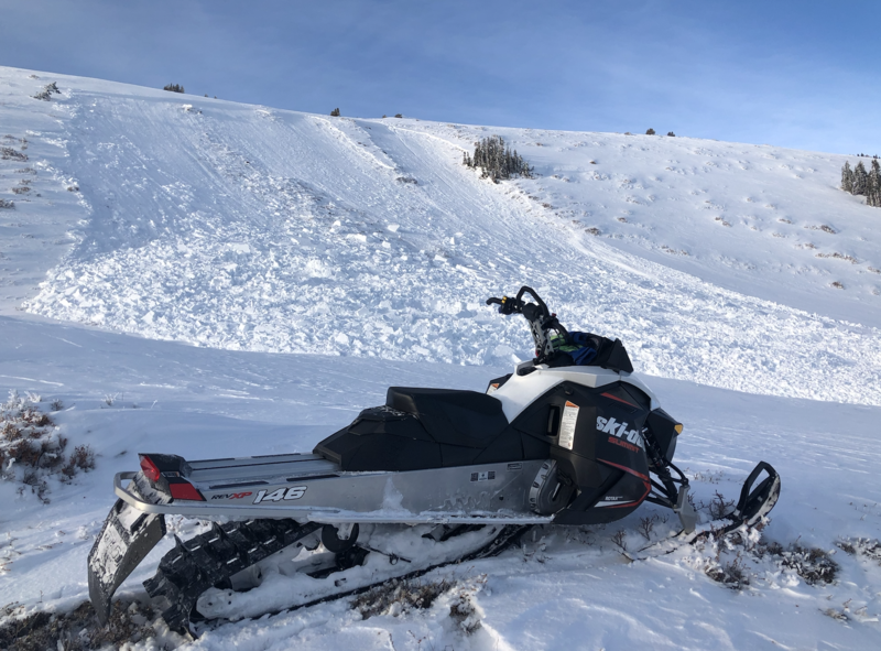 In most terrain the snowpack is deep, it's gaining strength, and it's happy in its own skin. However, we're not quite out of the woods just yet and as evidenced with Saturday's sled triggered slide, steep, rocky, upper elevation terrain remains suspect. So, while so much of our terrain is good to go, if you're travels take you to steep, technical slopes today, especially those with a thin, shallow snowpack, think about your exit strategy and the consider the consequences of triggering a slide that has the potential to break deeper and wider than you might expect. Or... with all the good riding out there and miles of terrain to choose from, simply avoid slopes with these characteristics.