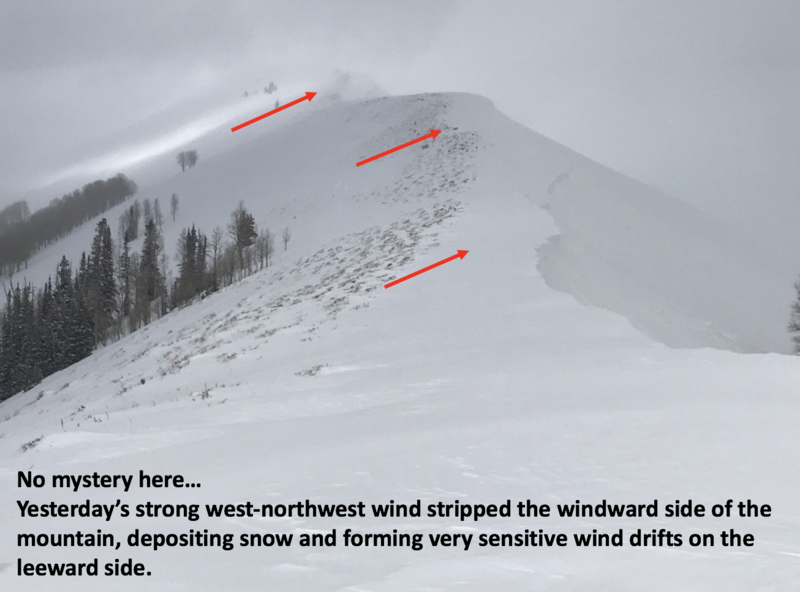 Yesterday's strong ridgetop winds had no problem drifting snow onto leeward slopes, especially those with an easterly component to its aspect and we found fresh wind drifts hyper-sensitive to our additional weight. I think the vast majority of yesterday's wind slabs settled overnight and won't be quite as reactive, but the Uinta's are a huge range and I'm always amazed how these mountains channel wind and snow into usual locations. Found mostly on the leeward side of upper elevation ridges, I wouldn't be too surprised to find a fresh drift or two cross-loaded around terrain features like chutes or gullies. More the exception than the rule, a rogue wind slab could break deeper and wider than you might expect, creating a slide that quickly gets out of hand. Your best bet for avoidance is to simply steer clear of any fat, rounded piece of snow, especially if it sounds hollow like a drum.