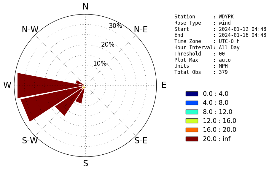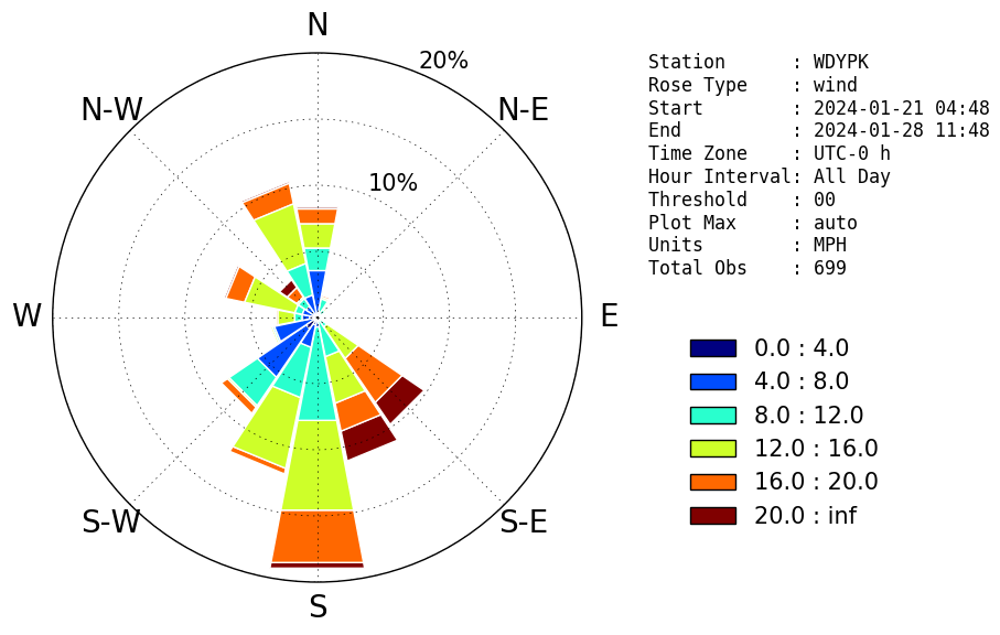 The pattern of winds during the last two weeks has been interesting. In the last 7 days (first wind rose) winds have been blowing from either the north or south with some slightly stronger winds from the SE. During heavy snowfall in the middle of January, hurricane-force winds blew from the west and southwest (second wind rose).