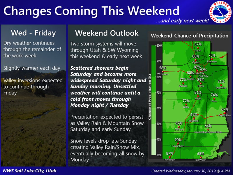 A few more sunny days are on tap with highs reaching into the 30's. Winds remain light and westerly, blowing in the 20's along the high ridges. Changes are on tap Friday and it will be warm and windy ahead of the first in a series of storms slated to impact the region beginning Saturday.