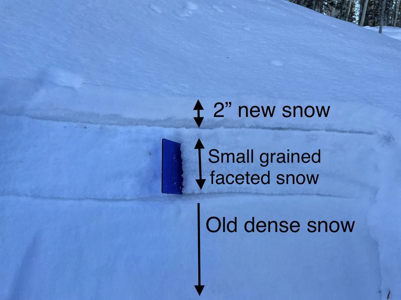 Not much going on at the moment, but looking into the past and present helps us look into the future in terms of snow stability and right now we're focusing on snow surface temperatures which ricochet all over the map. Cold temperatures at night and warm temperatures during the day create very weak, faceted grains close to the snow surface and this is what we call Near Surface Facets (NSF). The NSF was capped and preserved by last Tuesday's few inches of snow. Mark found it last week around Soapstone... captured in the image above.