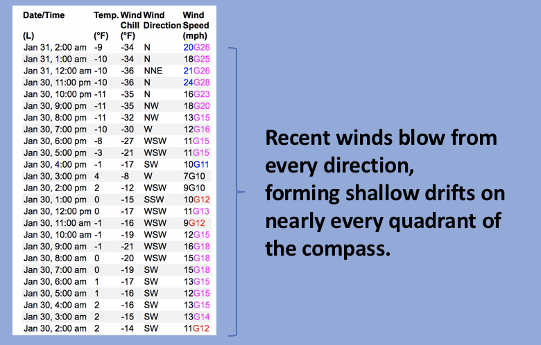 For the past few days winds have blown from every quadrant of the compass and there's no shortage of light snow available for transport. And while I think most of our fresh wind drifts have settled significantly, I bet there's a lingering drift or two that remains sensitive to our additional weight. Found on upper elevation leeward slopes and cross-loaded in chutes and gullies, both old and newly formed drifts may catch you by surprise, breaking deeper and wider than you might expect. This avalanche dragon is easy to navigate by avoidance... simply lose a little elevation, you lose the wind, and you lose the problem.