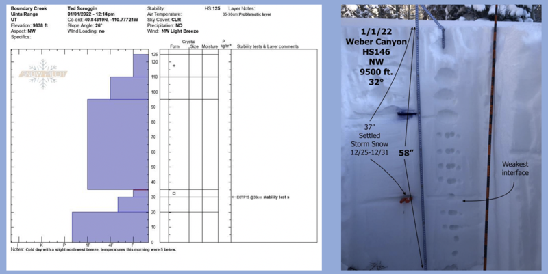 Over the weekend, Ted was on the east side of the range where he experienced collapsing and strong snow over weak snow... JG was in the Weber Canyon snowbelt and found a much stronger pack.
