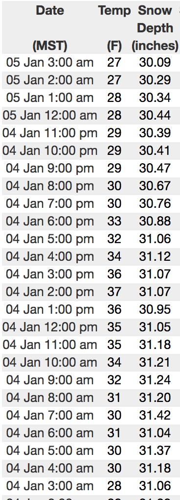 Above is recent hourly data from Upper Moffit Basin (9,126') along with wind data from Windy Peak (10,662'). To view more regional weather stations click here.