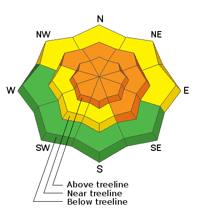In the wind zone, at and above treeline, you'll find CONSIDERABLE avalanche danger. Human triggered avalanches are LIKELY on steep, wind drifted slopes. Steep terrain facing the north half of the compass, and particularly slopes with an easterly component to its aspect are most suspect and should be avoided.
