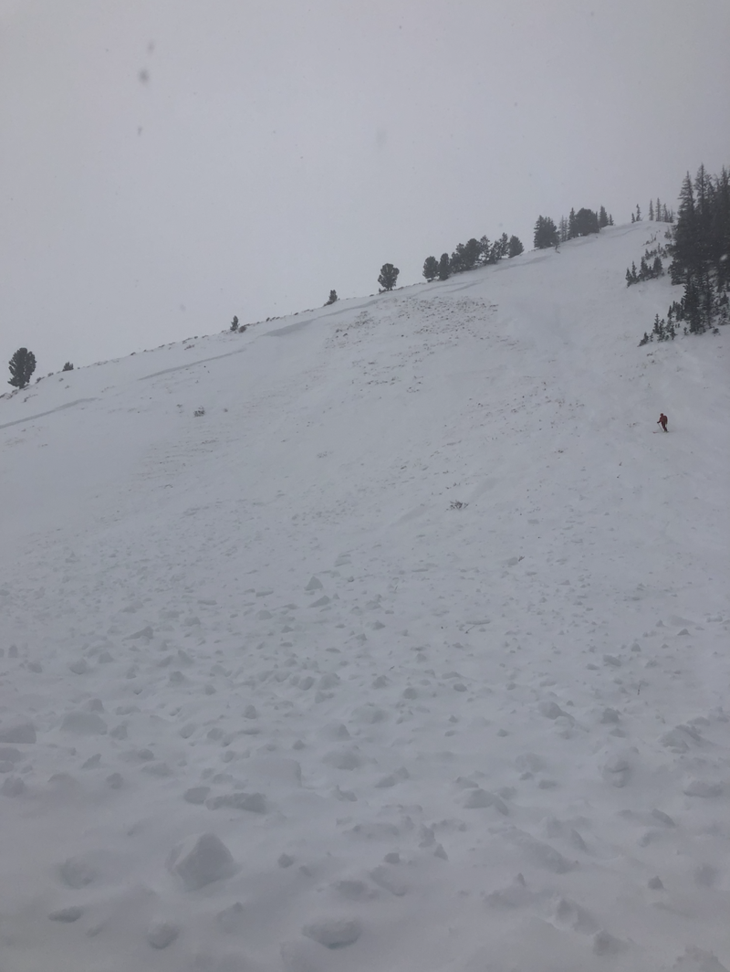 Yesterday, a very experienced avalanche professional and forecaster with decades of experience triggered this large avalanche as he stepped out onto the slope to investigate the snow structure. While the slide broke about 10-15 feet above him, it was years of professional experience that gave him the upper hand by utilizing a sub-ridge, or what we call an island of safety to quickly retreat to.
