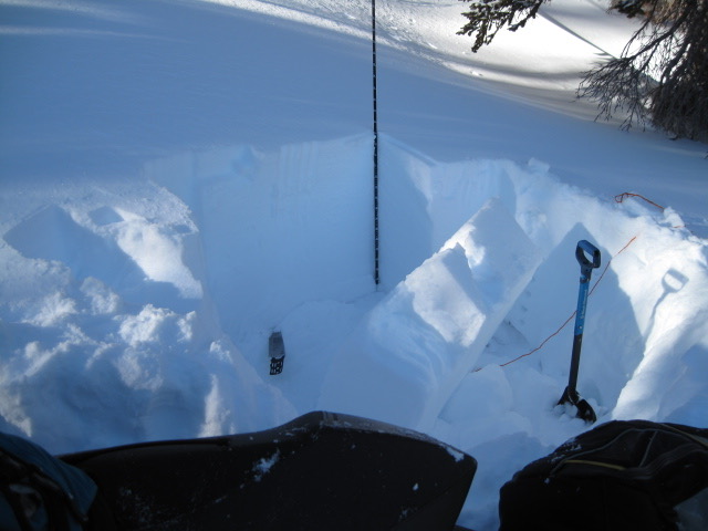 Meanwhile, back on the north half of the compass.... it took a few hard whacks out of the shoulder, but Ted was able to propagate a crack across the snowpit indicating a strengthening pack that still has the propensity to avalanche and break on weak snow buried deep in our pack once triggered.