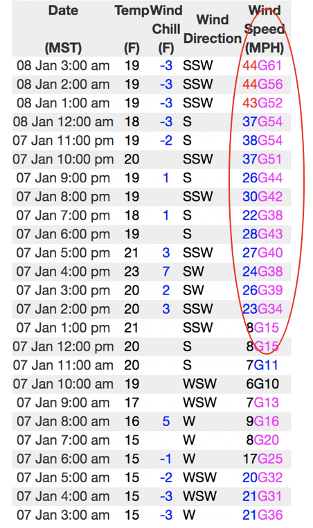 Above... a 24 hours data set from Lofty Lake Peak (11,186') illustrating the increase in wind speed.