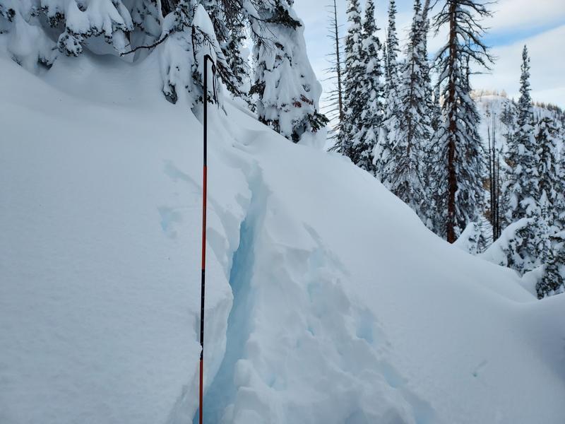 Micheal J was in lower Weber Canyon yesterday, experienced a large collapse, and notes... "I wasn't planning on writing a report today, however, on my way out of Weber Canyon I discovered this nasty collapse at 10k that failed 220 cms. to the ground and moved about 6 inches down slope before arresting." Big food for thought that not every slope has adjusted to the big New Years storm. MJ's writeup is found HERE.