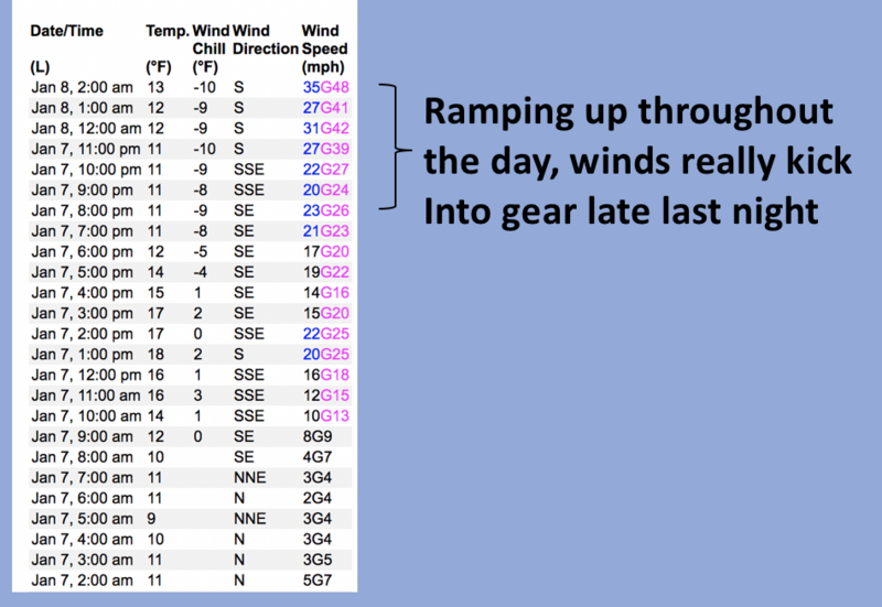 A 24 hour data dump from Lofty Lake Peak (11,186') clearly shows winds ramping up in the past couple of hours.