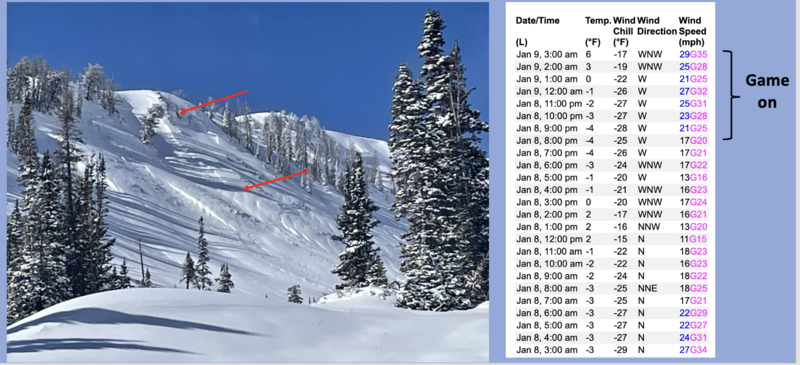 The biggest clue to avalanches is ???... AVALANCHES! In shallow snowpack zones we are already seeing natural avalanche activity and the slides are failing on the persistent weak layer (PWL) formed during the December dryspell. Without any wind it's just fluff on fluff, but Sunday nights uptick in wind speeds stiffened the snow surface, giving it just enough body to form soft slabs on isolated terrain features. This mornings wind changes the game, creating a stiff, cohesive piece of snow that's resting on weak, sugary snow.... no bueno!
