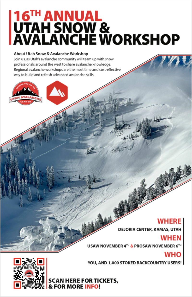 Sign up for the 16th Annual Utah Snow and Avalanche Workshop (USAW) IN PERSON, November 4th at the Dejoria Center in Kamas, UT. Sign up and get more info HERE.